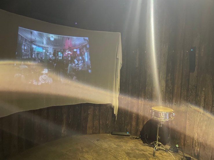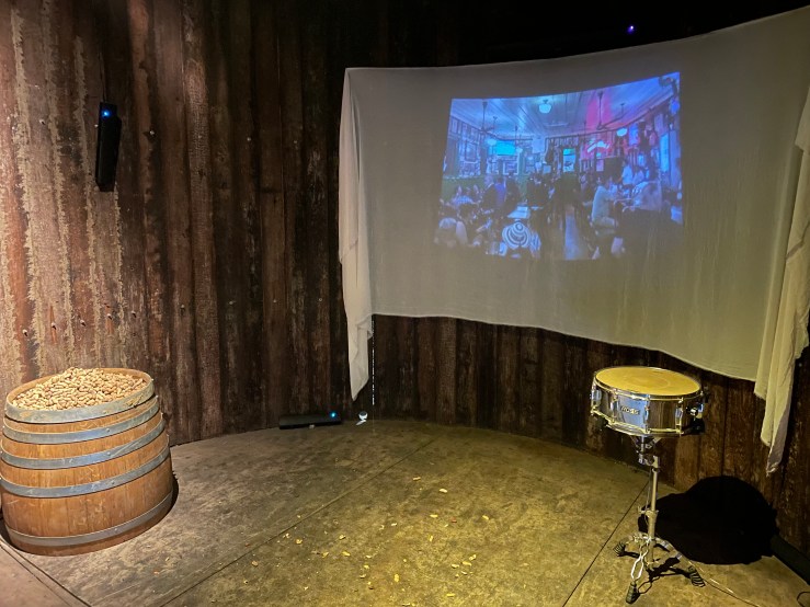 For this installation, a sequence of images was taken on-site; a snare drum with a mechanism to vibrate on its own and a barrel of peanuts, which people can take and throw the shells on the floor, as happens at Hussong’s, one of the places where people always have a very happy time.